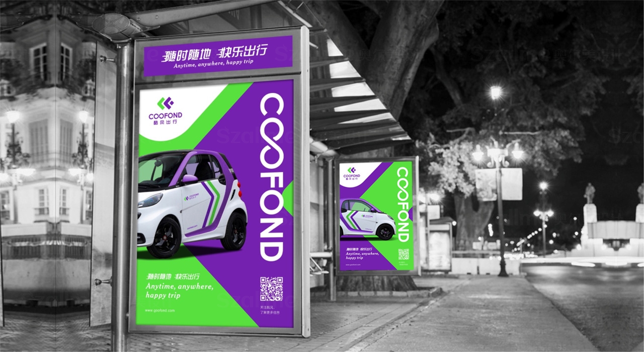 酷風(fēng)出行是一個(gè)以車(chē)共享業(yè)務(wù) 為主打的自主品牌,為了突顯競(jìng)爭(zhēng)力、與同行形成差異。在品牌形象設(shè)計(jì)過(guò)程中,借鑒其名英文名稱一"COOFOND” 中的首字母"CF” 創(chuàng)作元素,全新的品牌識(shí)別設(shè)計(jì)力求高品質(zhì)的共享汽車(chē)生活, 整體色調(diào)清新簡(jiǎn)約,平易近人,投射創(chuàng)新、年輕、動(dòng)的品牌形象,以反映獨(dú)特的品DNA及理念,加強(qiáng)品牌與顧客的情感聯(lián)系。