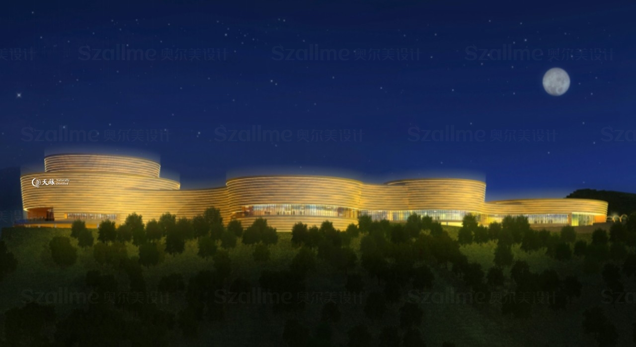 茅臺天釀景區位于中國酒都——茅臺古鎮,與茅臺酒廠一河之隔的西山公園山頂。項目總用地面積76186.6平方米,總建筑面積22360.56平方米。景區分為觀光索道、演藝劇場、觀景平臺、文化長廊、主題餐廳五大部分。劇場建筑外立面創作思路源于酒碗、酒壇和山地梯田,高高聳立在西山公園山頂,像是舉杯歡迎遠道而來的朋友。劇場外立面的線條就像一圈圈樹木的年輪,象征著悠久的醬香酒文化歷史。